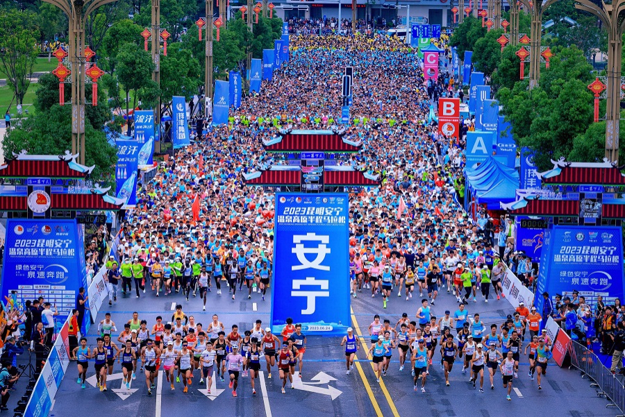 24日,2023昆明安宁温泉高原半程马拉松在云南省安宁市鸣枪开赛,来自国内外的1.5万名选手在生态风景线中尽情享受奔跑的乐趣。