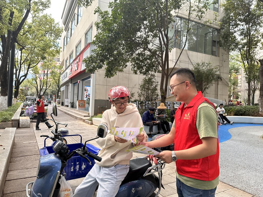志愿者们在街头向市民发放宣传单(6月13日摄)。陈志青 摄