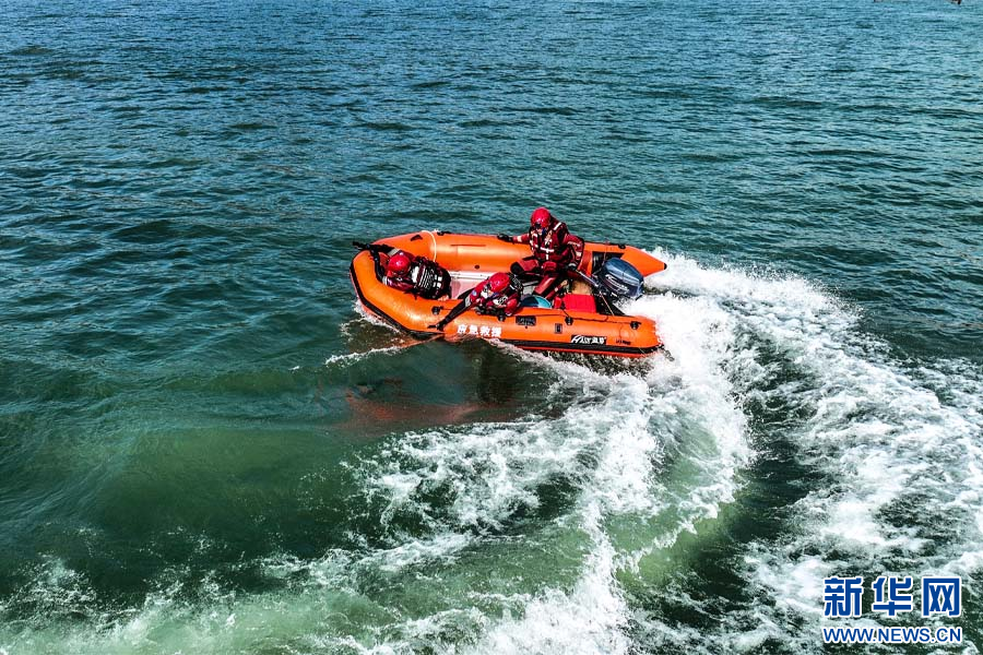 森林消防员进行舟艇编队搜救训练(7月1日摄)。新华网发(王兆富 摄)