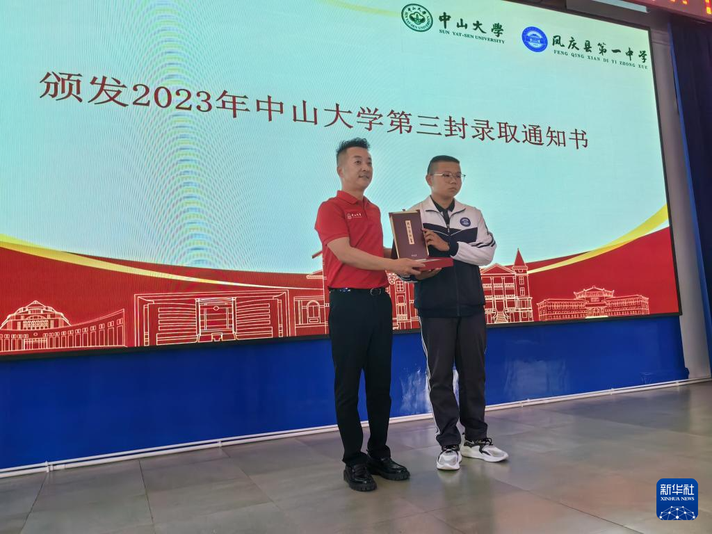 这是2023年中山大学全国第二封、云南首封录取通知书,由中山大学挂职干部、临沧市凤庆县副县长张哲亲手将其送到罗际航的手上。这个从小热爱中华传统文化的男孩,如今被中山大学中文系古文字学专业录取。