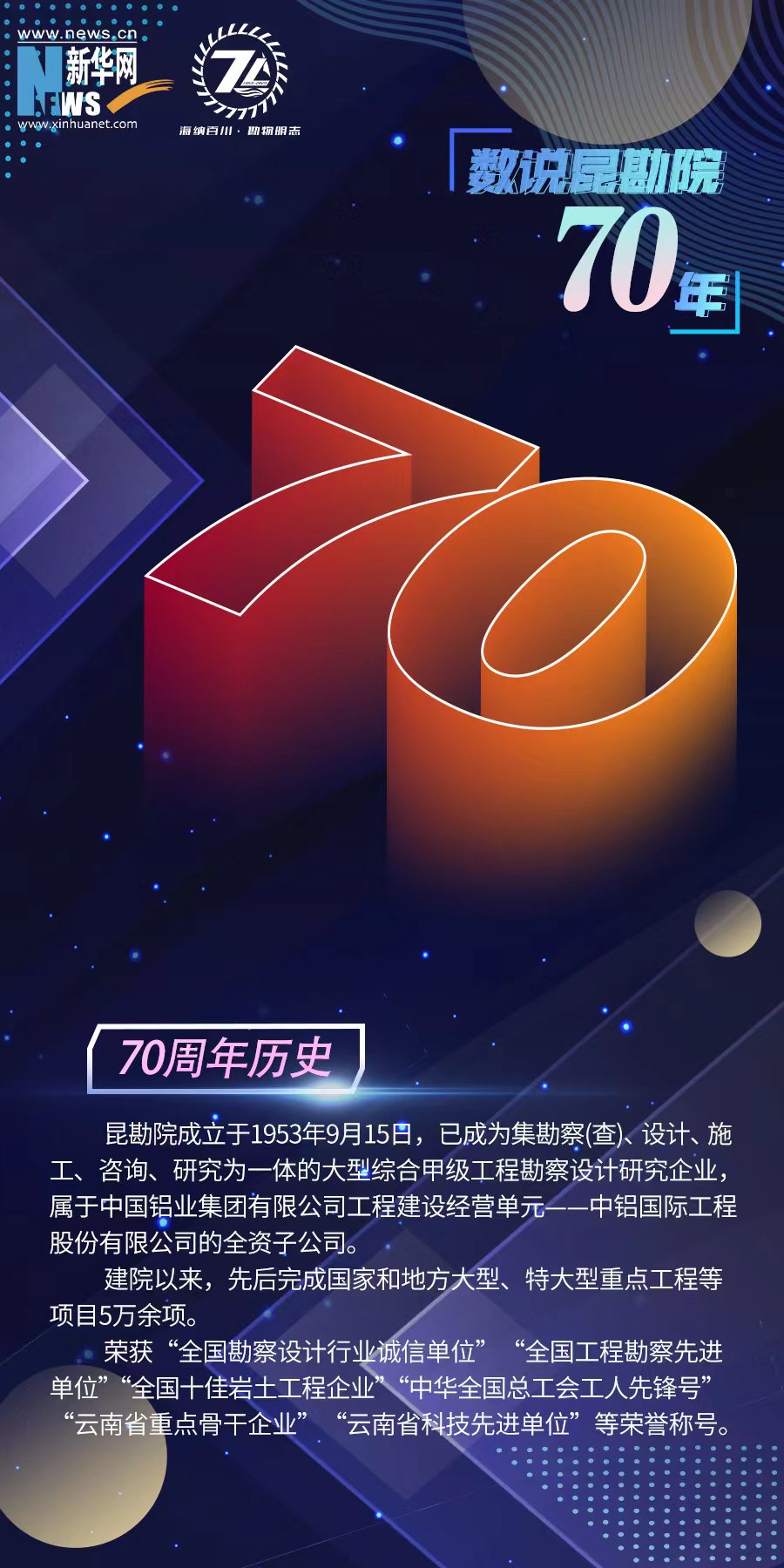 9月15日,云南省大型综合甲级工程勘察设计研究企业——中国有色金属工业昆明勘察设计研究院有限公司(以下简称“昆勘院”)迎来建院70周年。一组组数据,展现着昆勘院70年守正创新、砥砺奋进的历程。(完)