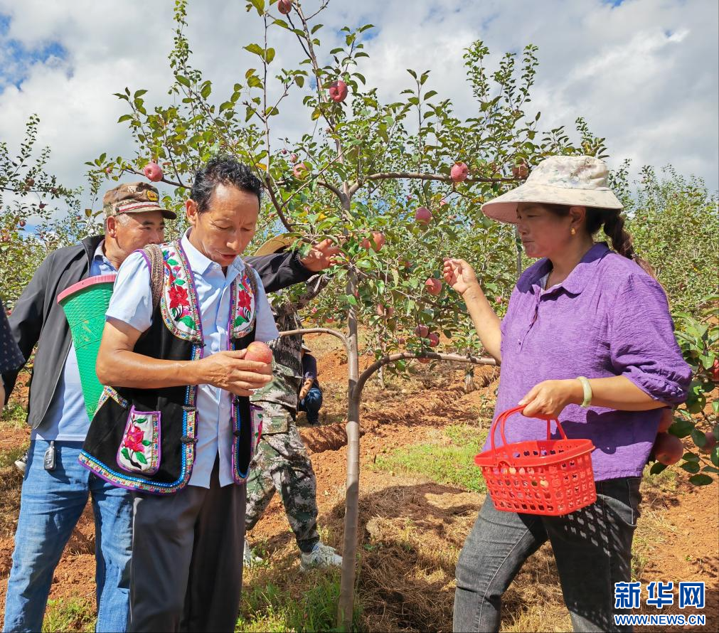 9月23日,农民群众到插甸镇长冲杨美丽种植养殖家庭农场采摘苹果,苹果种植大户杨美丽(右一)为大家传授苹果种植经验。