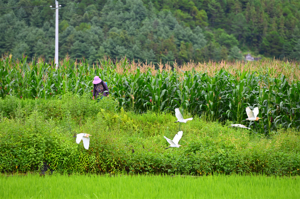 几只鹭鸶从田间飞过(8月1日 摄)。李志旭 摄