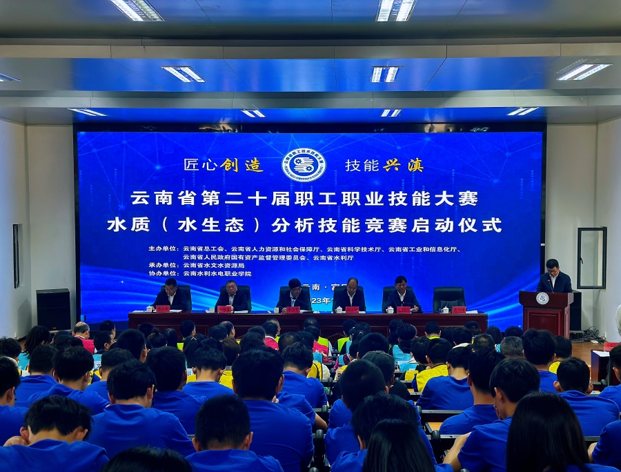 云南省第二十届职工职业技能大赛水质(水生态)分析技能竞赛启动仪式现场(10月25日摄)。云南水利水电职业学院 供图