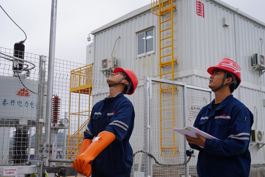 “90后青年突击队”开展升压站设备调试工作(10月25日摄)。资道勇 摄