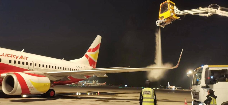 近日,受寒潮影响,昆明连续多日降温,昆明长水国际机场外界温度达到露点(指在一定的气压条件下,空气中的水蒸气开始凝结成液态水的温度)的气象条件,飞机机体和各操纵面可能出现霜、雪或结冰,云南祥鹏航空有限责任公司(以下简称“祥鹏航空”)积极备战除防冰工作,全力保障航班运行安全和正常。