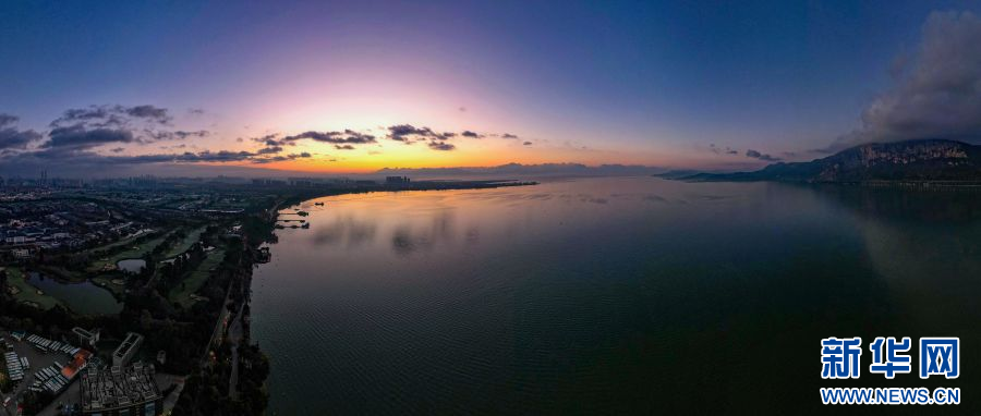 2024年1月1日,在云南省昆明市西山区滇池拍摄新年的第一缕晨光(无人机照片)。 (张正举 摄)