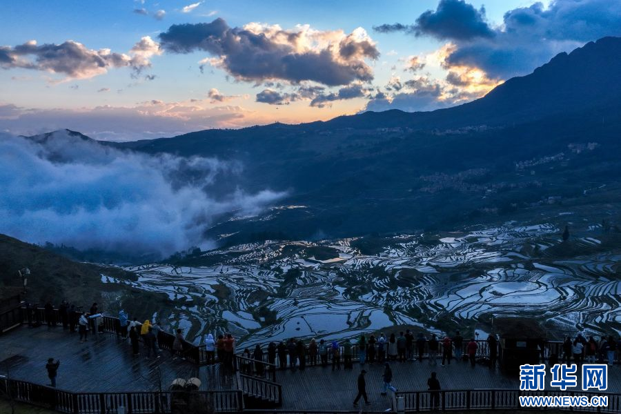 2024年1月1日,在云南省元阳县新街镇多依树观景台,游客观赏梯田日出。(张洪科 摄)