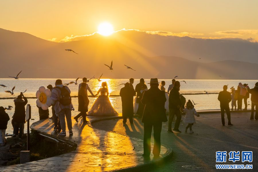 2024年1月1日,在云南大理洱海生态廊道,游客迎接新年的第一缕晨光,新人在洱海边拍下了婚纱照。(罗新才 摄)
