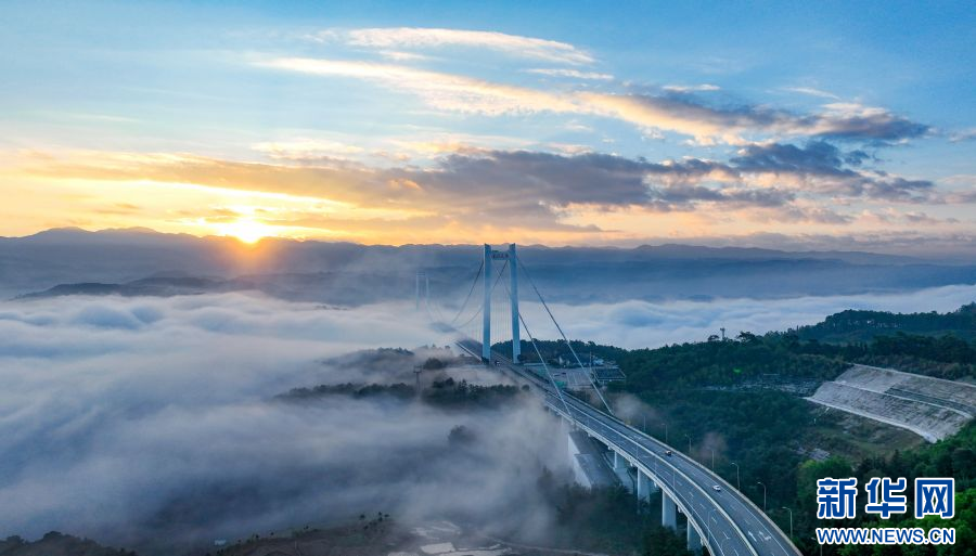 2024年1月1日,在云南腾冲市拍摄的保(山)腾(冲)高速公路上的龙江特大桥第一缕晨光。(龚祖金 摄)