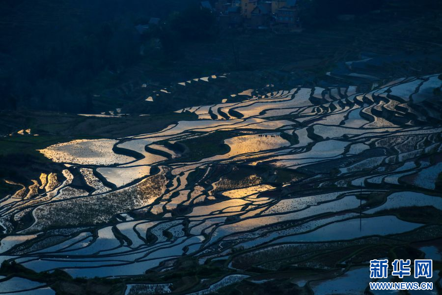 2024年1月1日,在云南省元阳县新街镇拍摄的朝霞映在梯田里的景色。(张洪科 摄)