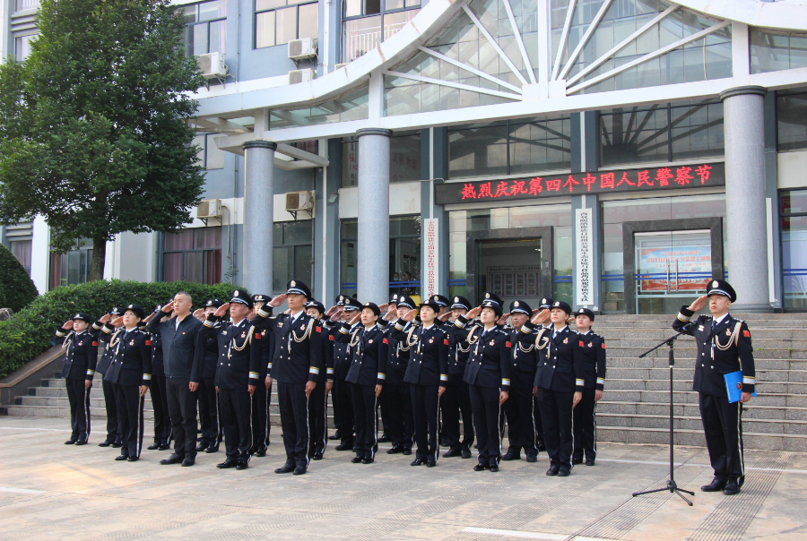 仪式现场,全体民警着警礼服,整齐列队。9时,升旗仪式开始,仪仗队员迈着铿锵有力的步伐,护卫着中国人民警察警旗行进到旗杆前。伴随着嘹亮的中国人民警察警歌,“升中国人民警察警旗,敬礼!”随着号令,全体人员肃立敬礼。