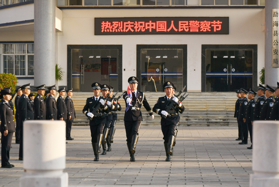 10日,西双版纳傣族自治州公安机关举行中国人民警察节升警旗仪式,热烈庆祝第四个中国人民警察节。西双版纳州副州长、州公安局党委书记、局长余海坤参加仪式。各(县)市公安局同步举行升警旗仪式。