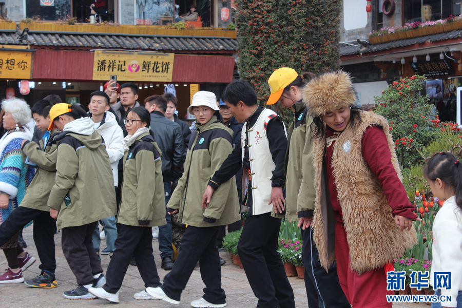 参加研学的学生在丽江古城体验纳西族传统打跳(2月2日摄)。新华网发(和新兰 摄)
