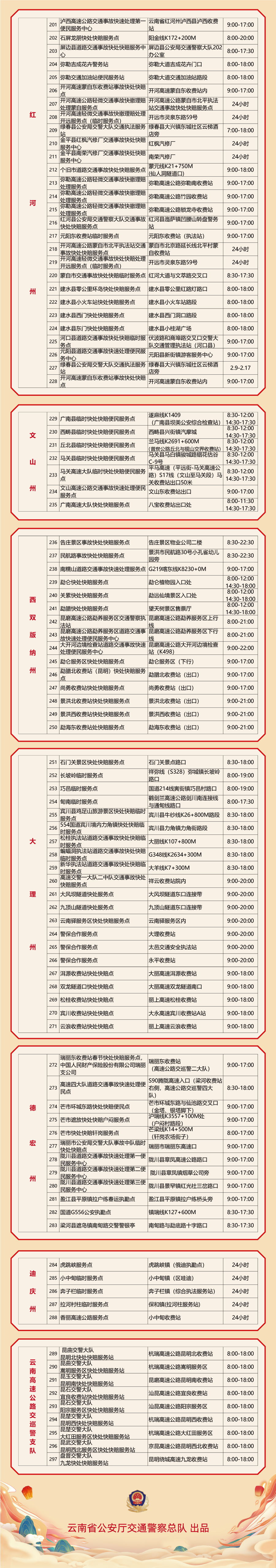为确保云南省2024年春节期间道路交通安全畅通,云南公安交管部门启动道路交通事故处理节假日模式,联合保险机构共同在高速公路、重点国省干道及热点旅游沿线的服务区、收费站及交通警察执法站等场所设置道路交通事故快处快赔临时服务点297个,为春节期间群众出行提供全方位、便捷、高效的事故认定、定损、理赔等道路交通事故快处快赔服务。