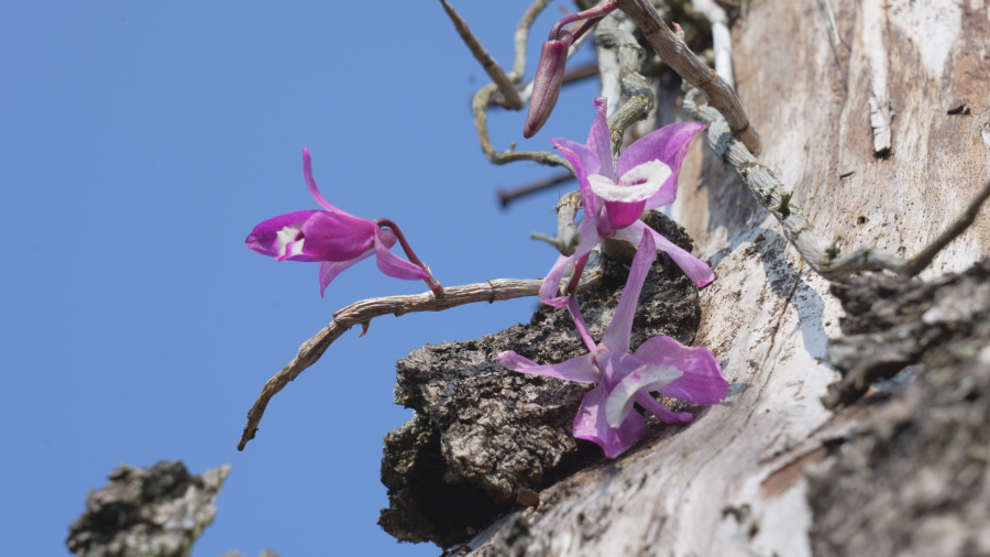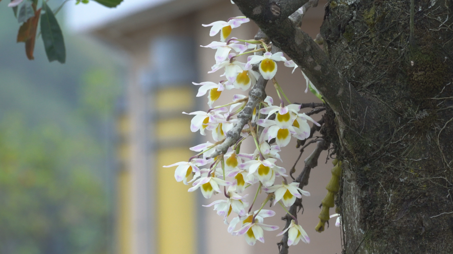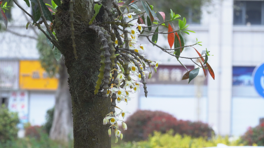 时下,正是云南省保山市龙陵县百花争相盛开的季节。作为龙陵县“县花”的石斛花已悄然绽放在城市的街头巷尾,色彩各异的石斛花依树而生,美得让人移不开眼,成串的鼓槌、紫瓣的金钗……成了龙陵独特的亮丽风景,深深吸引着市民的目光。