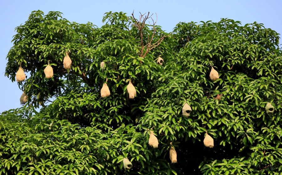 在帕当一组观鸟点可以看到树上挂满黄胸织布鸟的鸟巢,有几只黄胸织布鸟在即将完成的巢穴查看,对巢穴进行最后的“精装修”。