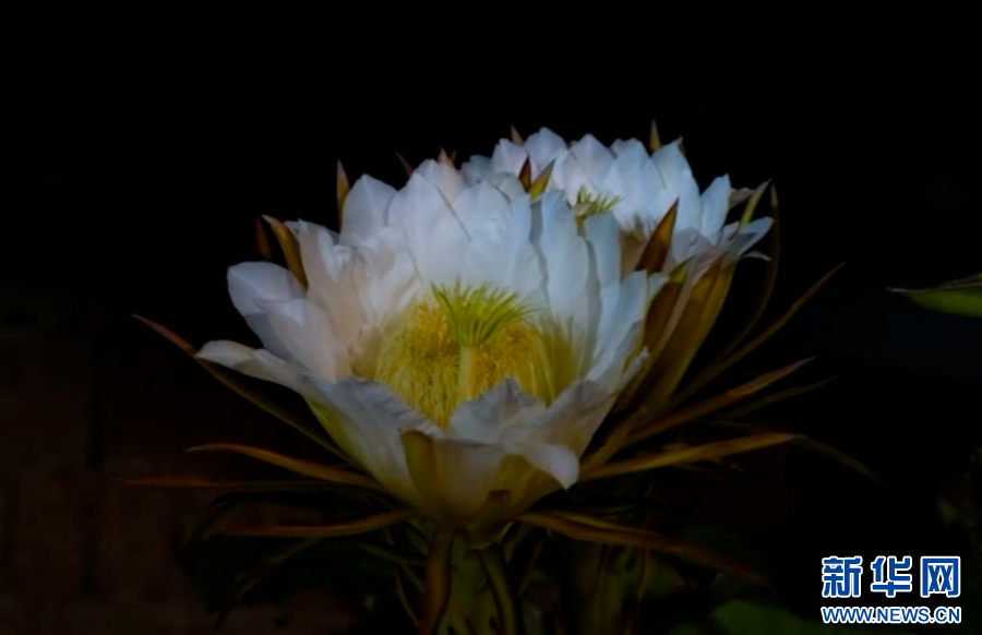 近日,云南省德宏傣族景颇族自治州瑞丽市的摄影爱好者,用延时摄影记录下火龙果花盛开的瞬间。与火龙果果实热烈的颜色不同,火龙果花的花瓣洁白剔透,花蕊淡黄,在月光下显得娴静淡雅。