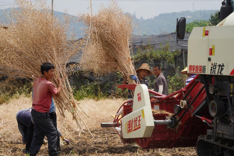 临翔区博尚镇永泉村村民在收割油菜(4月21日摄)。黄显芳 摄