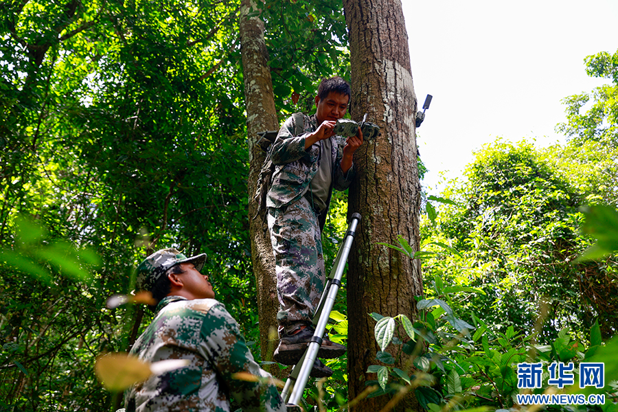 云南西双版纳国家级自然保护区勐养管护所关坪管护站的监测人员正在维修预警相机(7月27日摄)。新华网发 徐华陵 摄