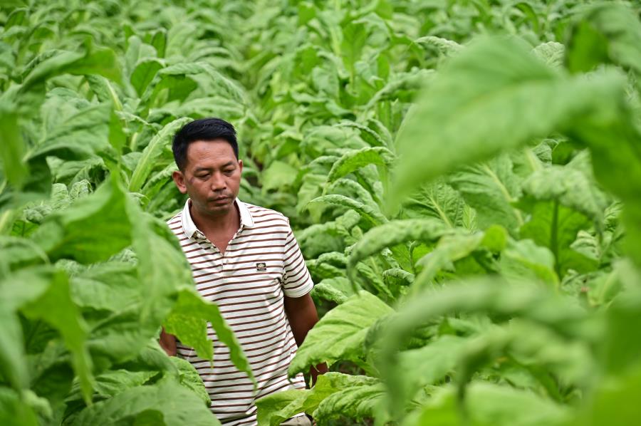 施晓峰在查看烟叶长势(8月6日摄)。郭康 供图