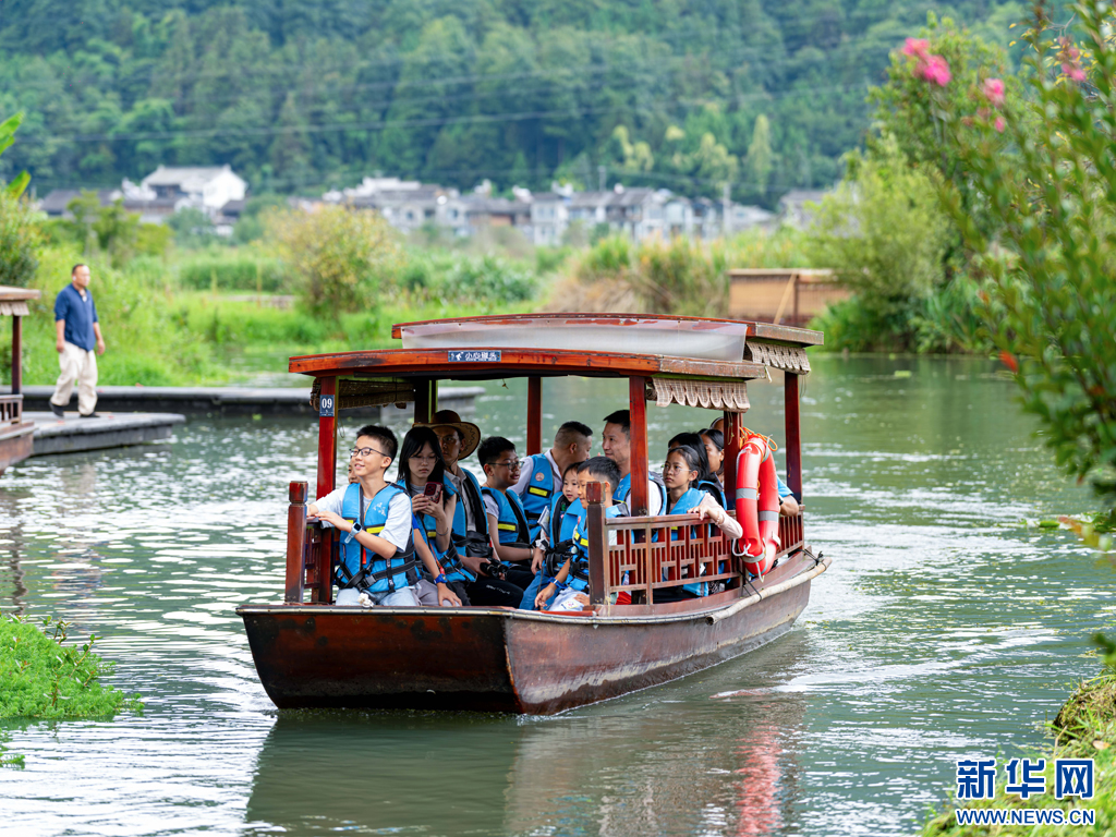 游客正在和顺古镇乘船游玩(8月11日摄)。新华网发(曾三东 摄)