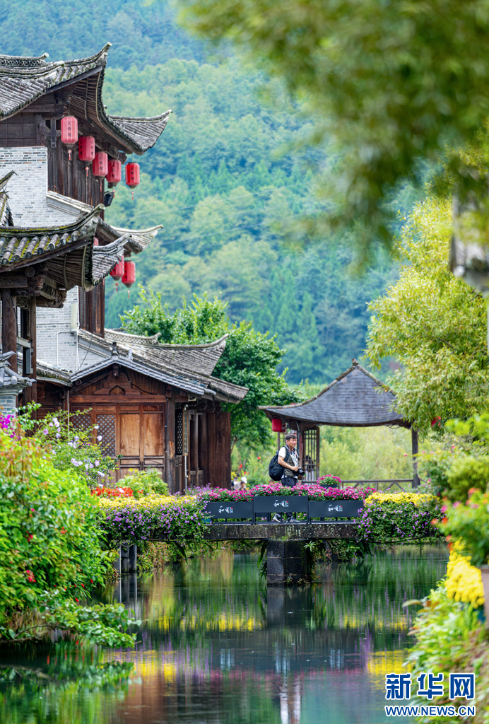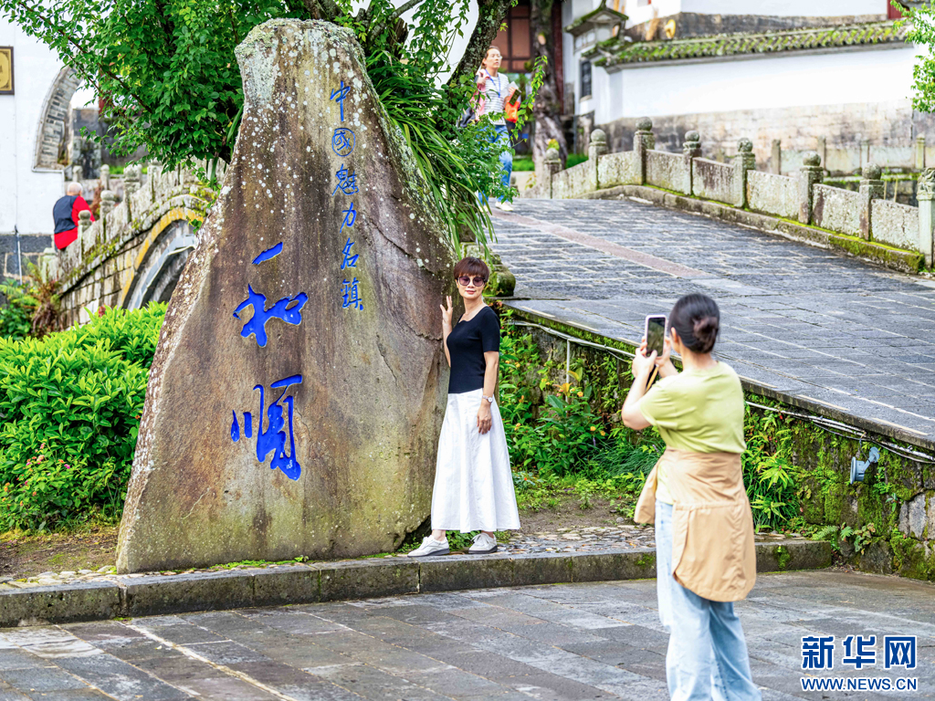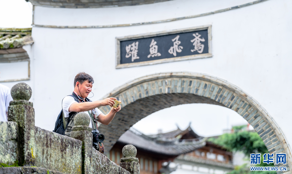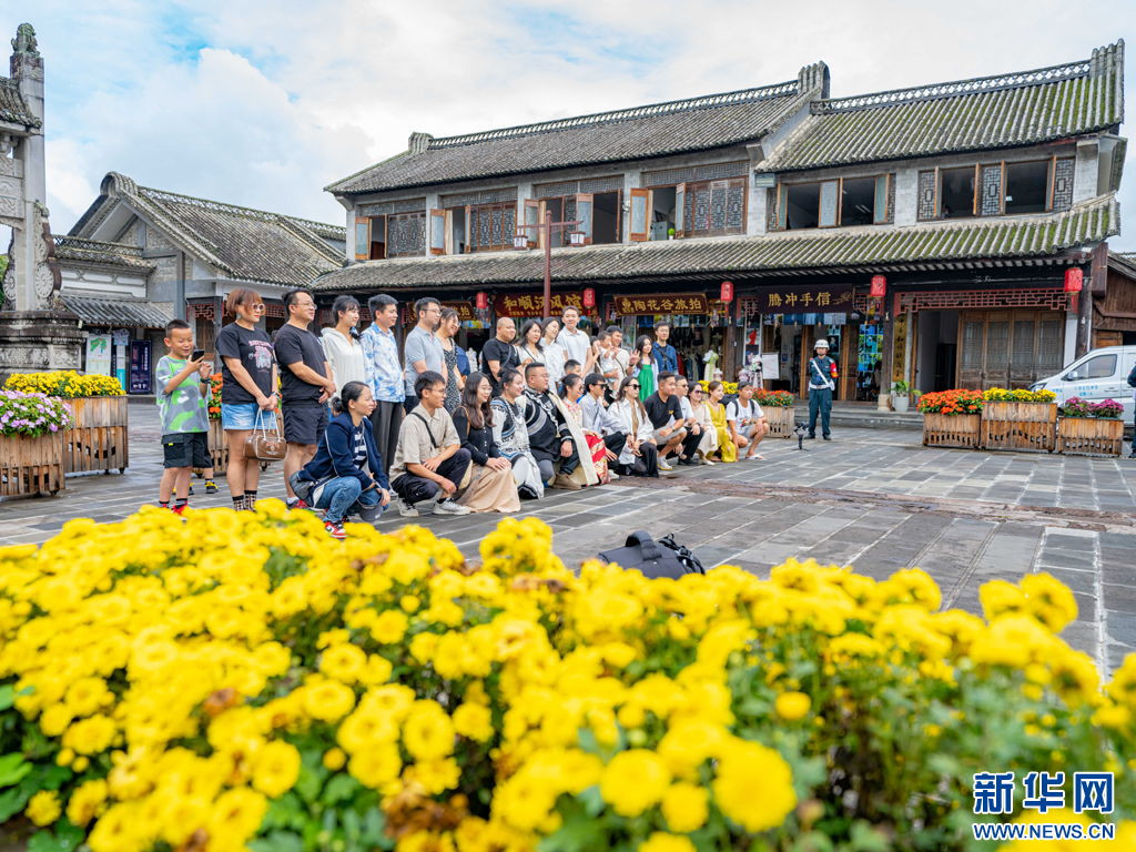 游客正在和顺古镇拍照打卡(8月11日摄)。新华网发(曾三东 摄)