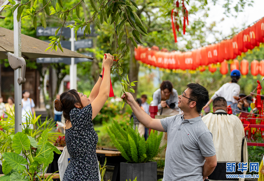 游客正在和顺古镇某古树上系挂美好祝愿(8月11日摄)。新华网发(曾三东 摄)