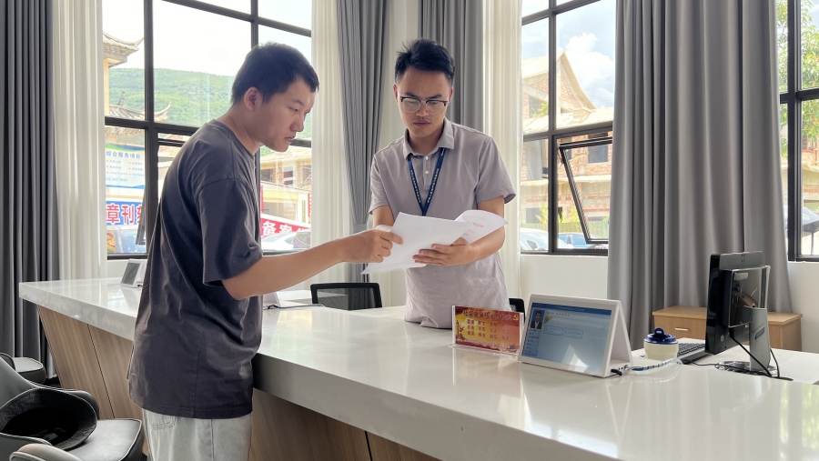 石屏县烟草专卖局工作人员为办事群众解读许可证办理相关政策(8月20日摄)。李楠 摄
