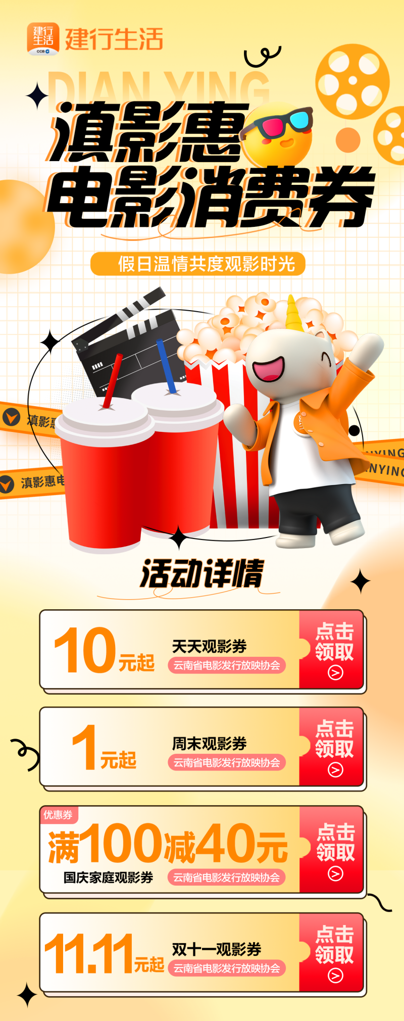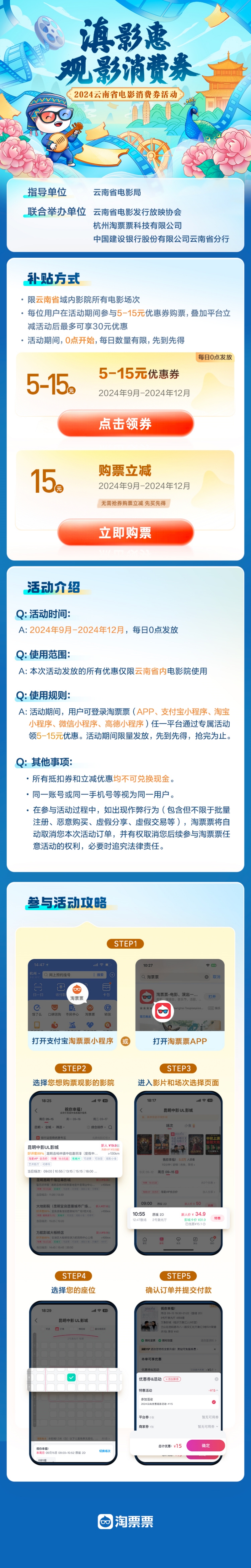 为激发广大电影观众消费热情,云南省将于本月推出“滇影惠”电影消费券发放活动。本次活动由云南省电影局指导,云南省电影发行放映协会、杭州淘票票科技有限公司、中国建设银行股份有限公司云南省分行联合举办。