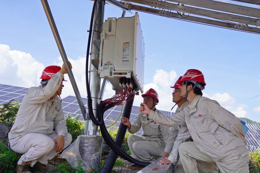 “工程建设党员突击队”在光伏方阵内查找问题(8月27日)。资道勇 摄