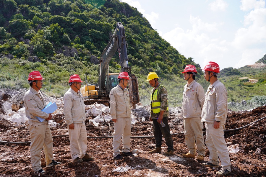 “工程建设党员突击队”在与工程人员现场沟通进度(8月21日)。资道勇 摄
