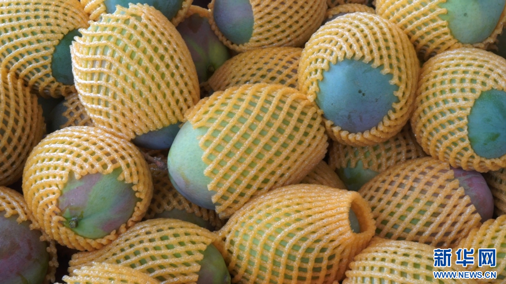 基地里,工人们采摘芒果,准备陆续送往分拣中心。在分拣中心,工人们对芒果进行分拣、套袋、装箱,等待装车运往全国各地。