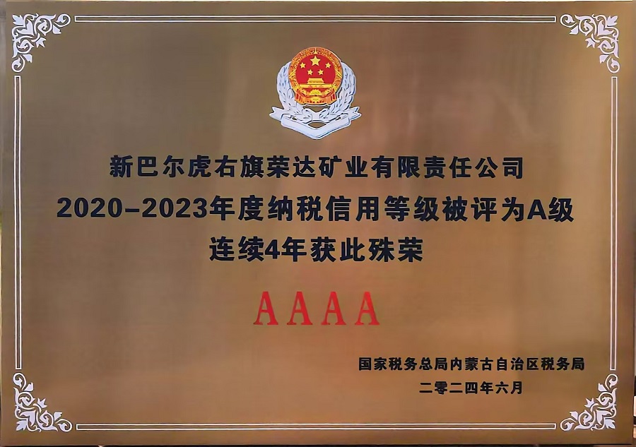 在地处内蒙古自治区新巴尔虎右旗的荣达矿业有限责任公司(以下简称“荣达矿业”)里,摆放陈列着一块“连续4年获‘纳税信用等级A级’荣誉奖牌”,奖牌由国家税务总局内蒙古自治区税务局颁发。