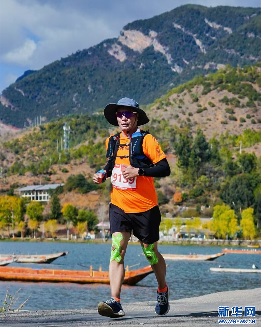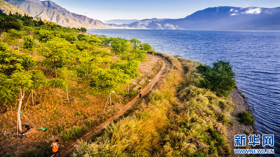 选手在美丽的泸沽湖畔奔跑(11月24日摄)。新华网发(丽江市教育体育局 供图