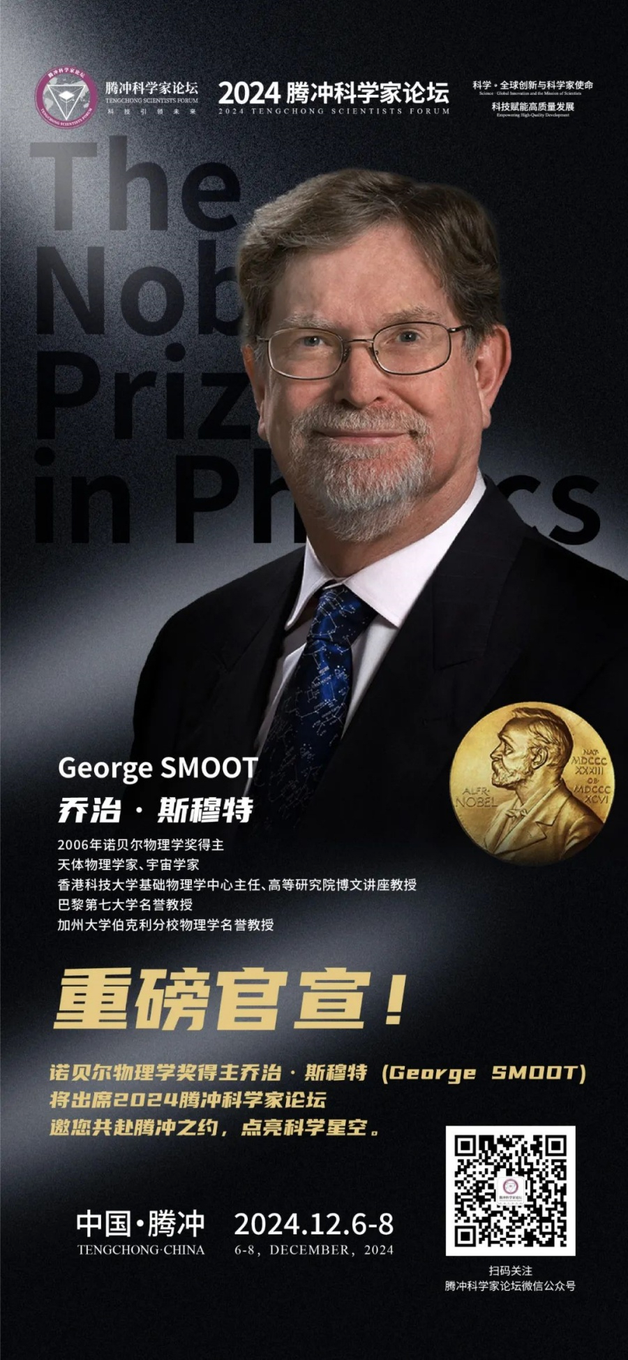 2024腾冲科学家论坛将于12月6日至8日在云南省腾冲市举办。届时,诺贝尔物理学奖得主乔治・斯穆特将出席论坛。