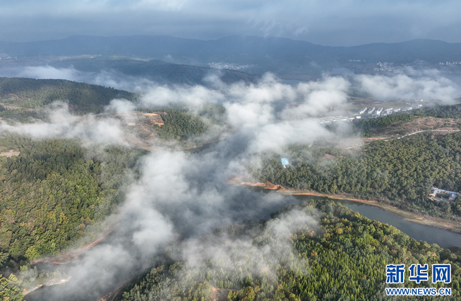 山林、湖水、田地、民居好像披上一层轻纱(11月30日摄)。新华网发(孙文来 摄)
