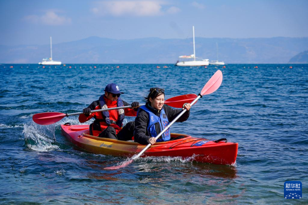 1月12日,游客在抚仙湖上体验帆船和皮划艇。新华社记者 王静颐 摄
