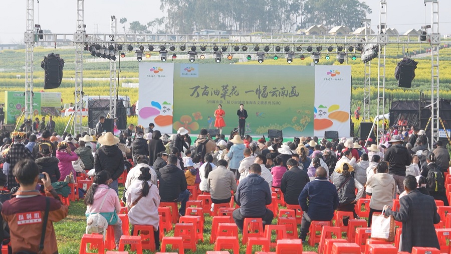 2月9日,丙麻乡以“万亩油菜花·一幅云南画”为主题举办了第三届万亩油菜花海农文旅系列活动。活动现场,精彩的文艺表演接连上演,赢得观众阵阵掌声。放眼望去,在花海栈道上,游客们穿梭其中,纷纷拿起手机拍照,用镜头定格这一美景。