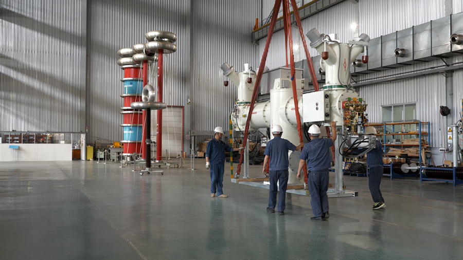 云南开关厂有限责任公司技术人员正在为110KV组合电器做试验(2024年7月摄)。胡精灵 摄