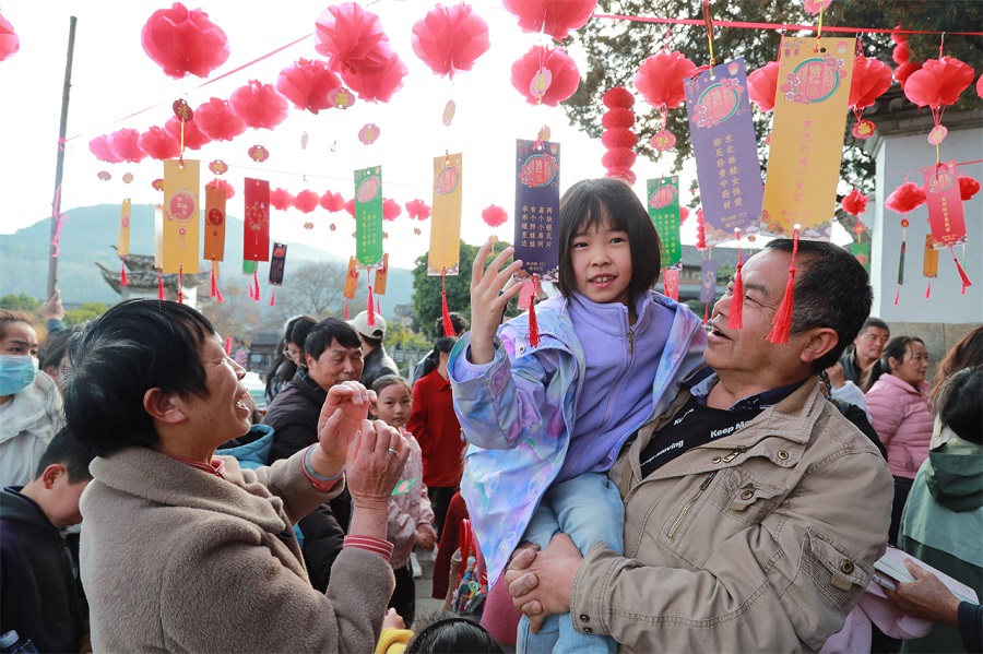 活动现场,飞檐斗拱的百年古建筑,古朴的火山石月台,苍劲的古柏树,被火红的灯笼和五颜六色的灯谜贴装点得典雅喜庆。此次猜灯谜活动共设置谜面300份,融知识性和趣味性为一体,奖品有当地书法爱好者现场书写的福卡,还有图书和生活日常用品等。该活动已经连续举办4年,深受广大读者和游客喜爱。(完)(刘正凡)