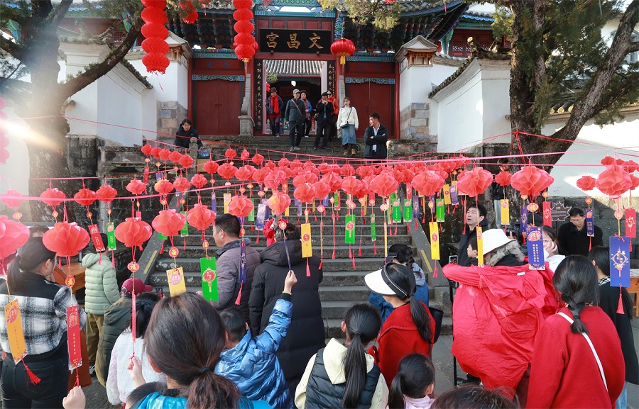 2月12日,云南省腾冲市在和顺古镇文昌宫大月台举办猜灯谜活动,吸引了众多群众和游客前来参与。