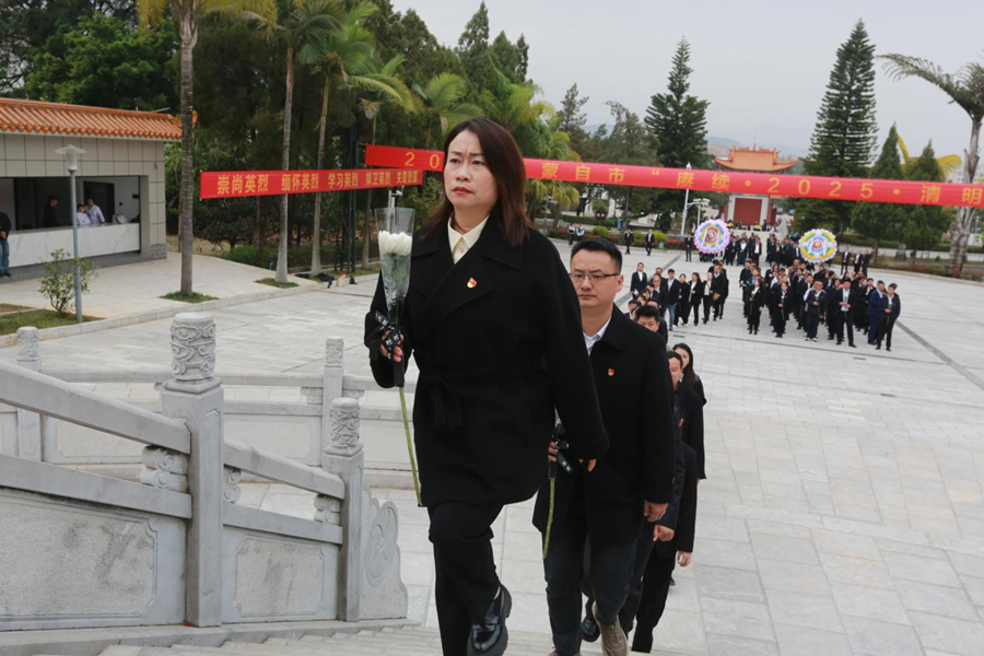 中国人寿财险红河州中心支公司职工在蒙自烈士陵园纪念碑前献花。(4月3日摄)薛莹莹 摄