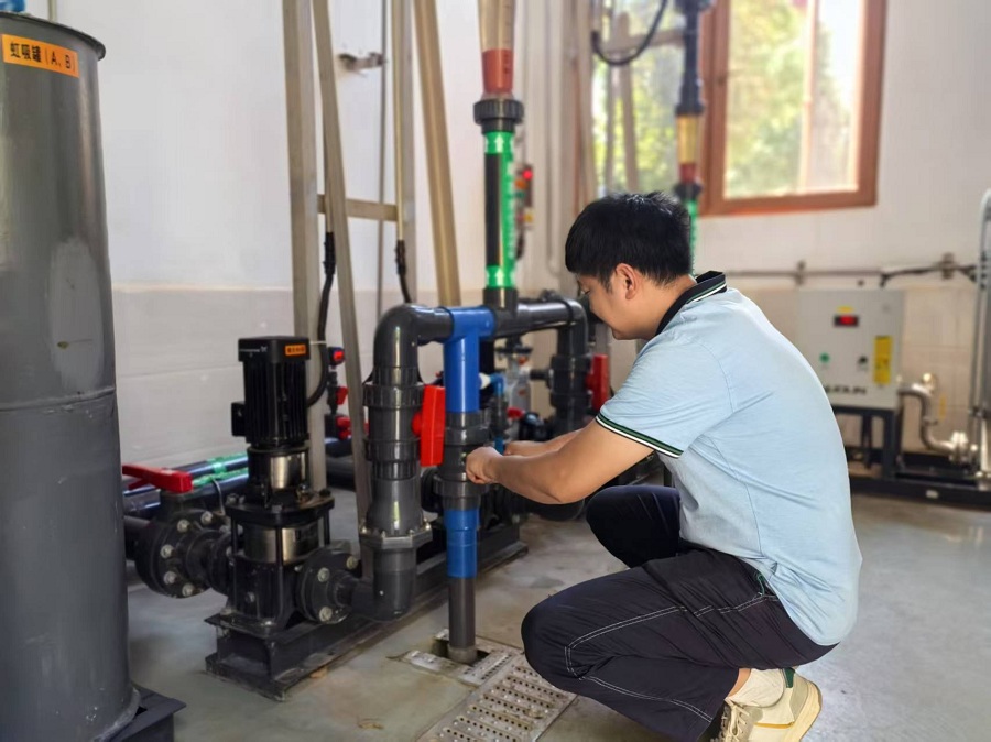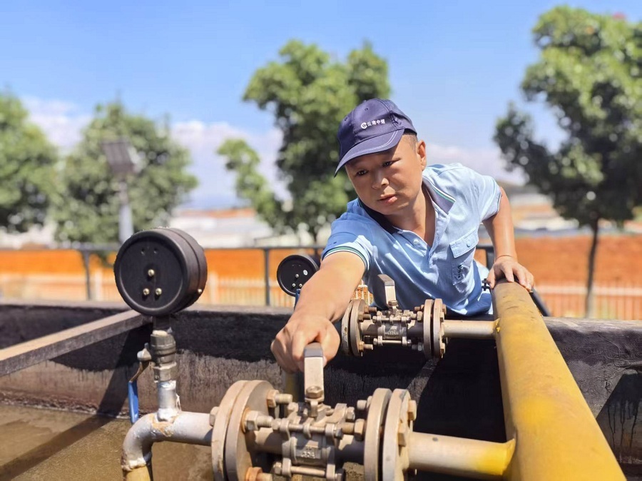 在膜池旁,机修班机修工贺思海师傅正调试新装的曝气调节阀。“这些微生物就像‘菌宝宝’,必须给它们创造最适宜的生存环境。”他盯着压力表说道,“0.06兆帕,这个压力刚刚好。”