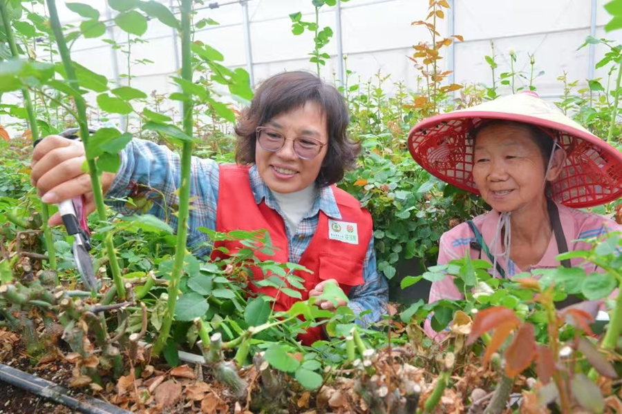 服务站指导教师在花田里指导花农科学种花(资料图)。