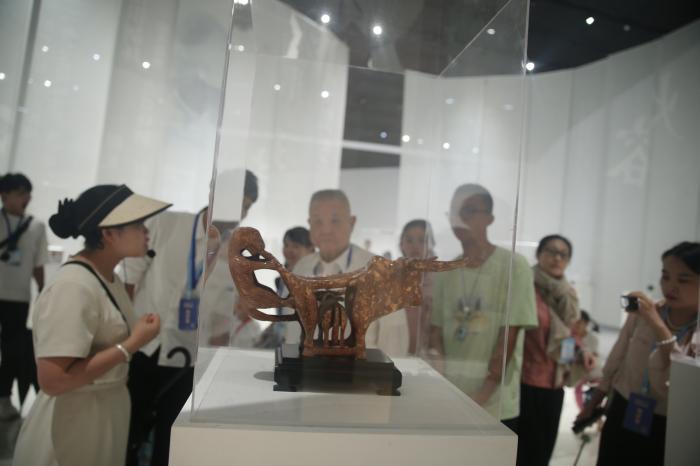 8月6日,台湾新媒体人观看斑铜“牛虎铜案”摆件。黄兴鸿 摄
