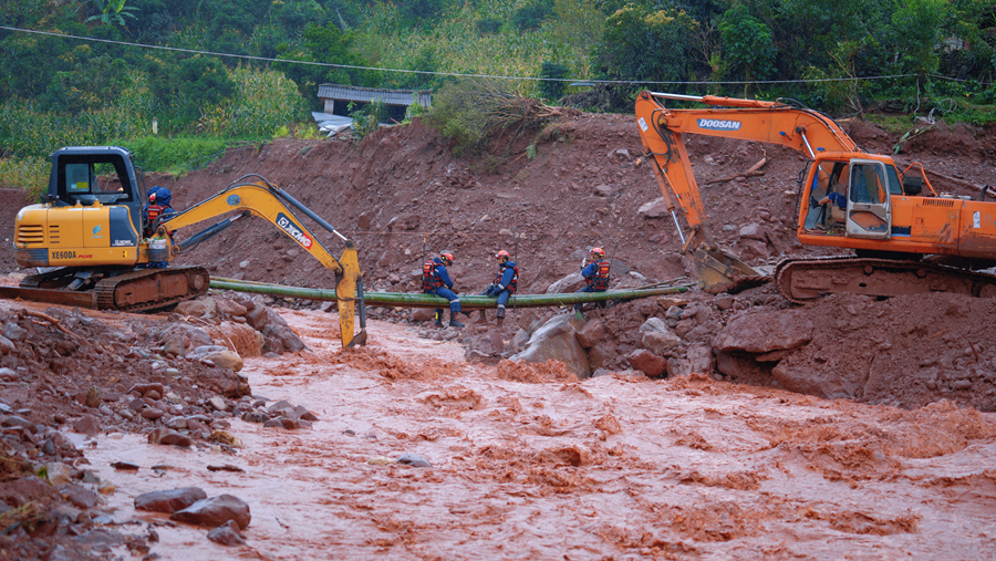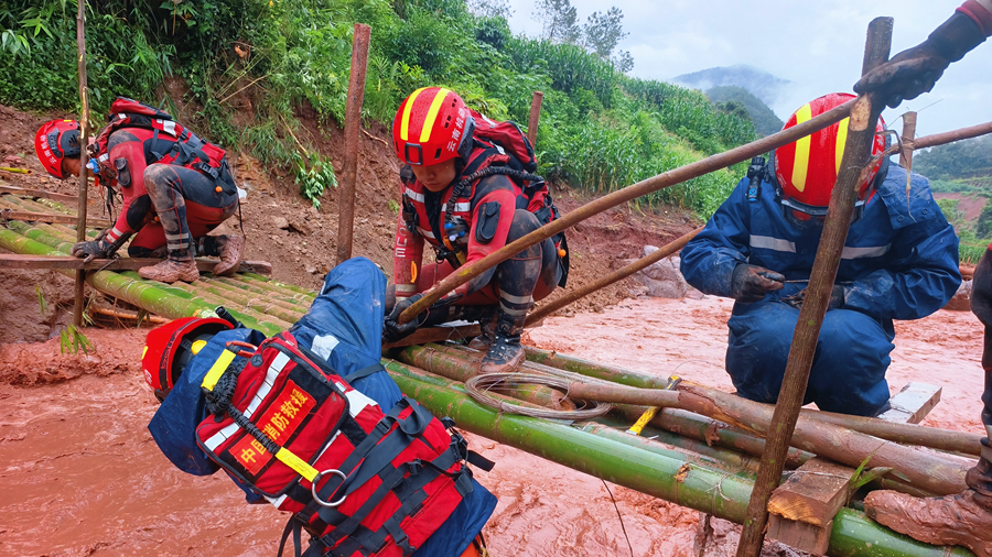 当天上午10时50分,队伍抵达受灾最严重的磨黑镇团结村乱石头村民小组。队员们就地取材,用方木、竹子等成功架起一座10米长的便民人行桥,打通了被阻断的河道交通。目前,消防指战员仍在继续开展清淤排险工作,全力保障群众安全。(完)