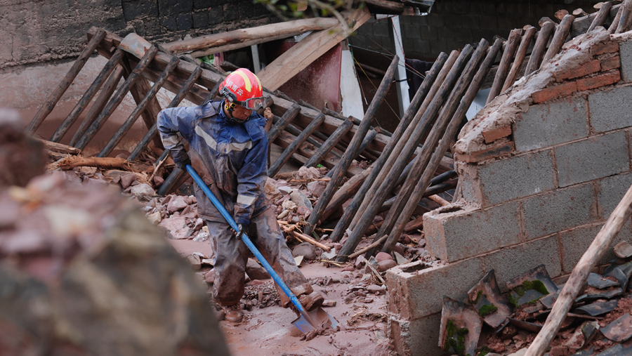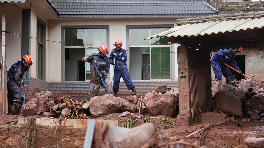 在团结村乱石头村民小组,消防员在清淤(8月23日摄)。李尧明 摄