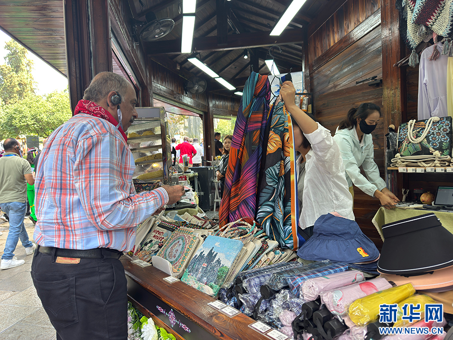 外宾在昆明石林风景名胜区购买旅游纪念品(9月7日摄)。新华网发(李浩 摄)