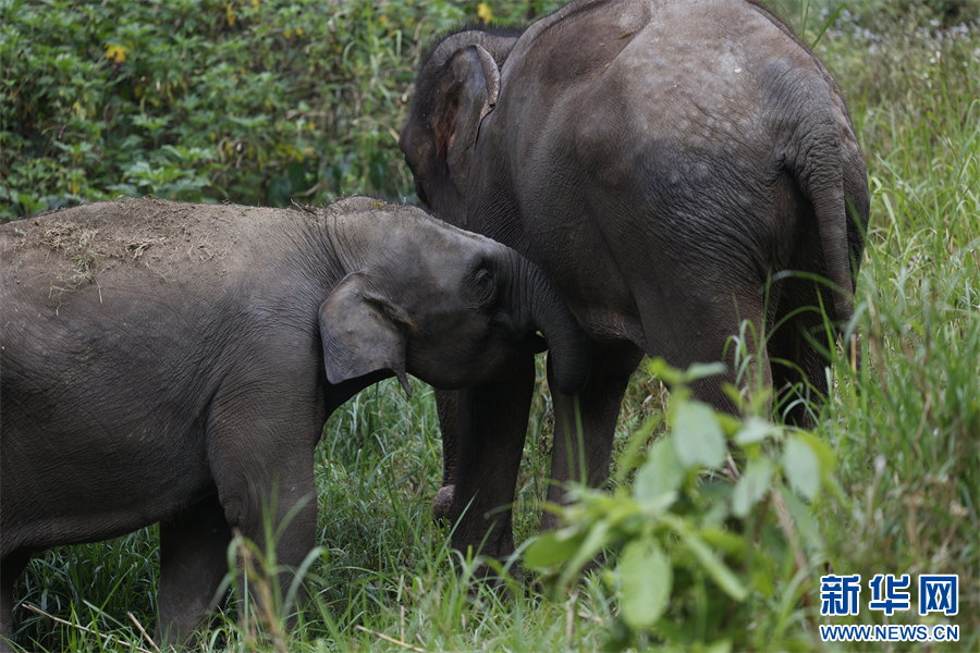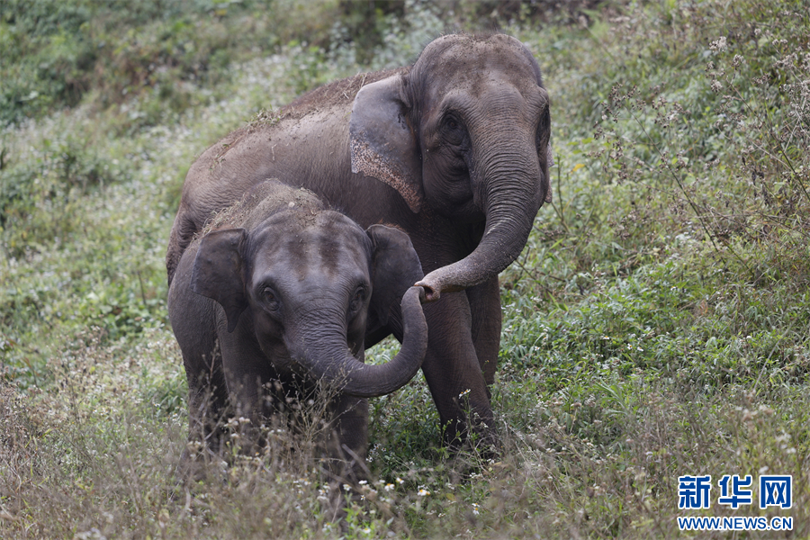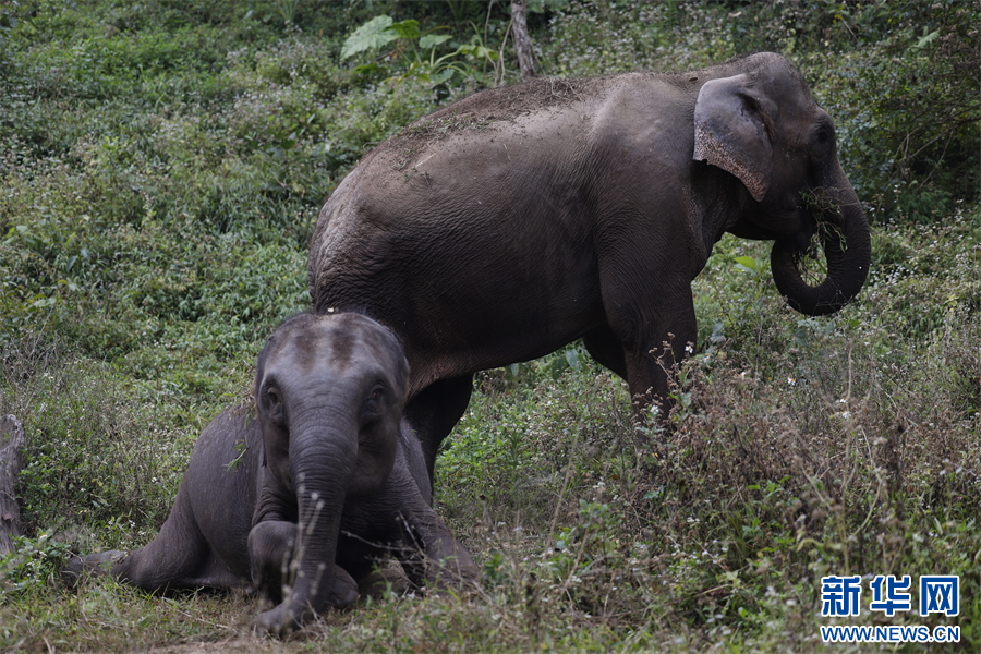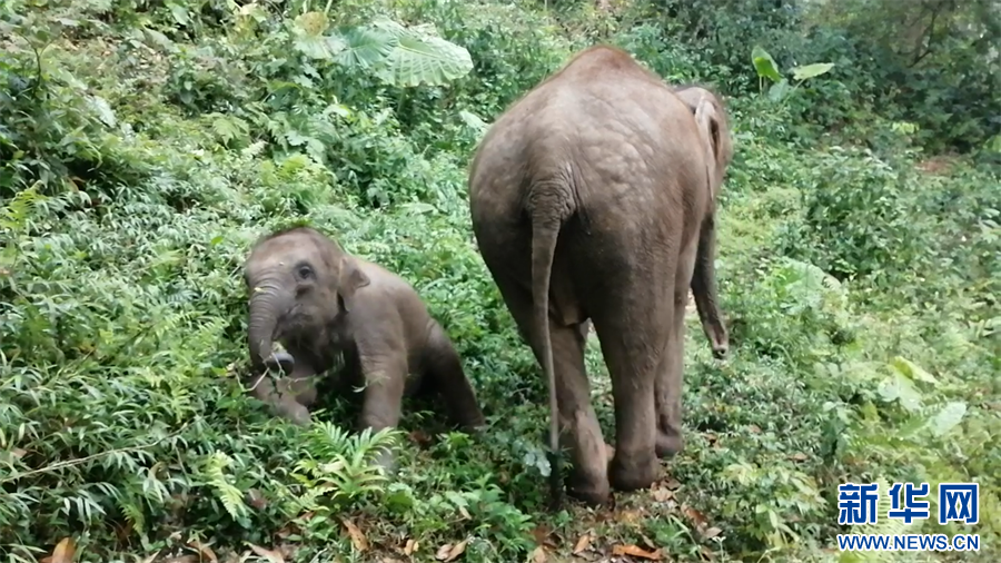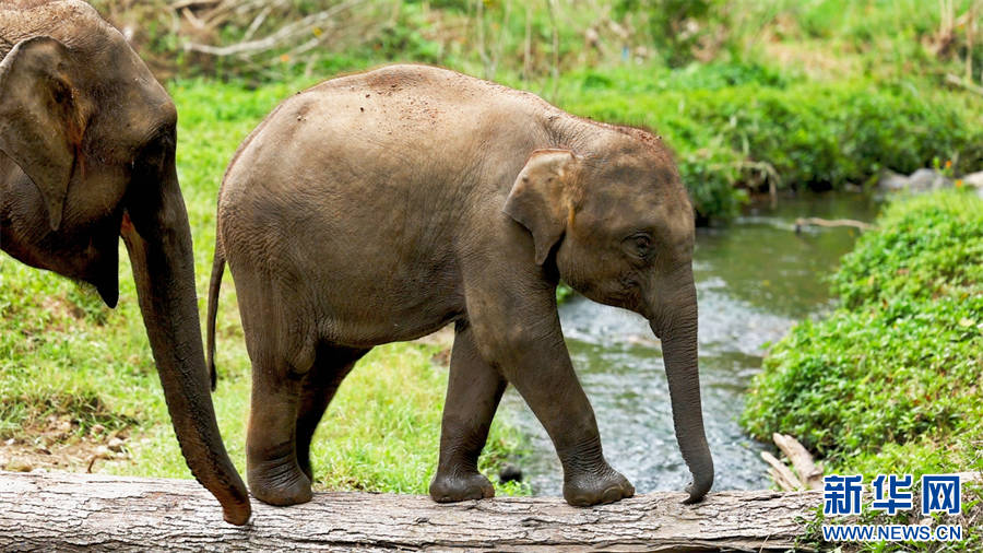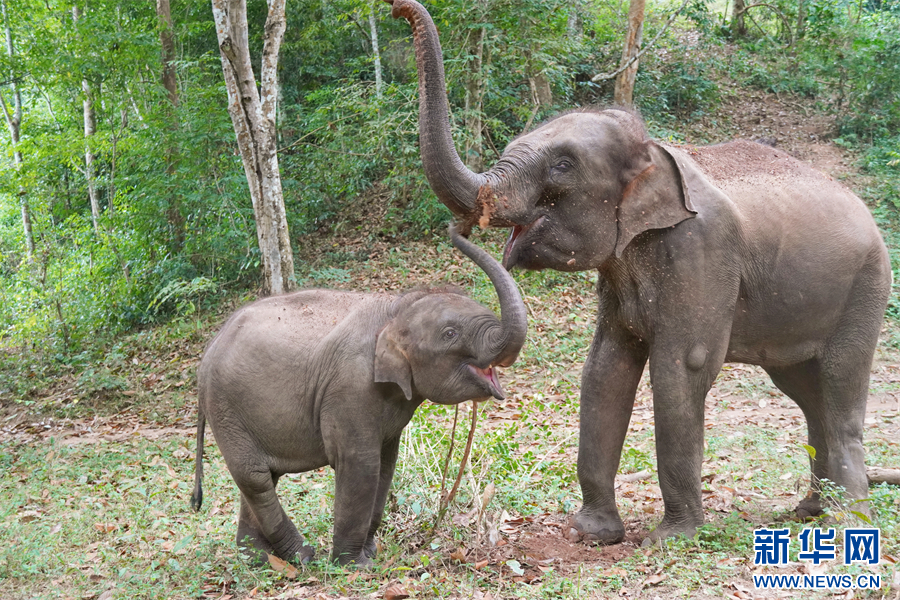 幼年的“景景”(左)在妈妈身边玩耍(资料图)。新华网发(云南西双版纳国家级自然保护区管护局 供图)